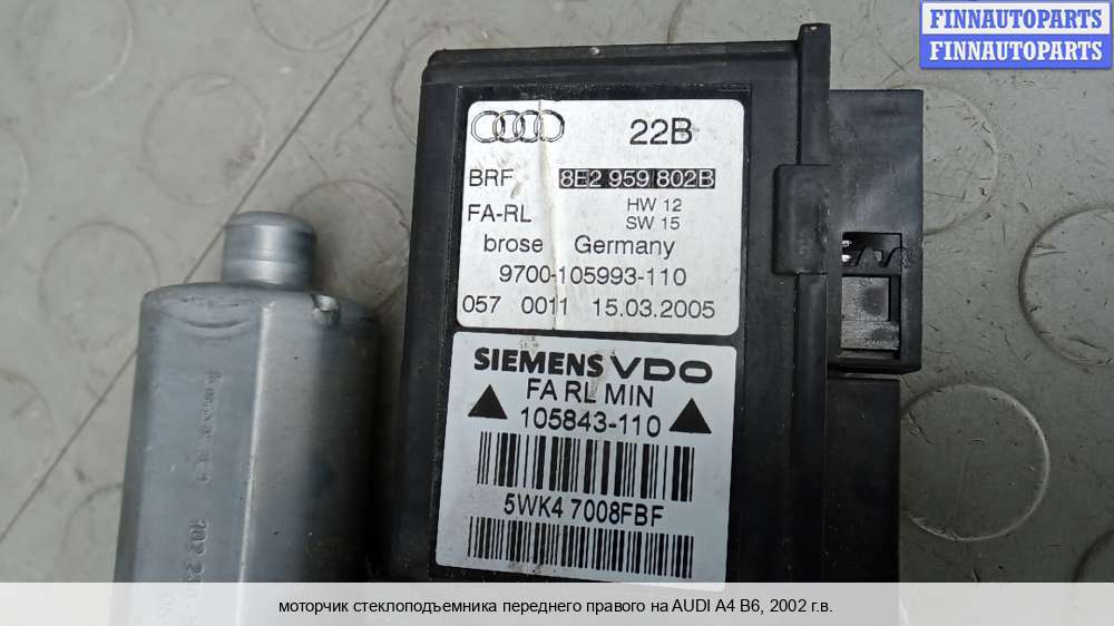 Компания FINNAUTOPARTS занимается продажей контрактных (б/у, бывших в употреблении) запчастей для иномарок. В нашей компании продаются только оригинальные запчасти из Европы, Японии и Кореи, которые не имеют пробега по РФ. Если вы хотите приобрести стеклоподъемник (передний правый) для а/м Ауди А4 Б6, смело обращайтесь в нашу компанию. Все наши менеджеры — профессионалы своего дела, и с удовольствием помогут вам купить запчасти, в том числе, стеклоподъемники передние правые, на Audi A4 (8E/8H, B6) и другие автомобили.