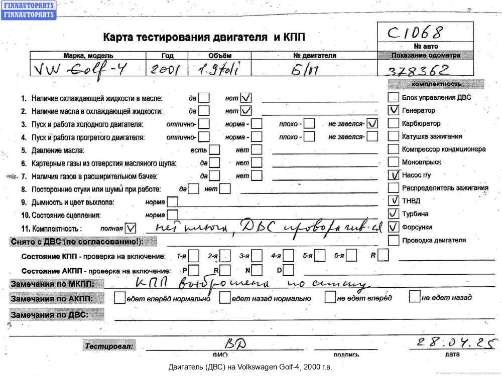 | Нижний Тагил | 2005 | 038100037N, 2005, 1.9л, Дизель, SDI, AQM, AQM232089, 038100037N, Универсал, белый, Фото не актуально, с запчасти отделены: Маховик, Насос гидроусилителя руля (ГУР), Патрубок охлаждения, AQM232089 | - | Г | К | КК, прокручивается, состояние ГРМ - нормально, поддон - нормально, клапанная крышка - нормально, эмульсия - нет, | |||